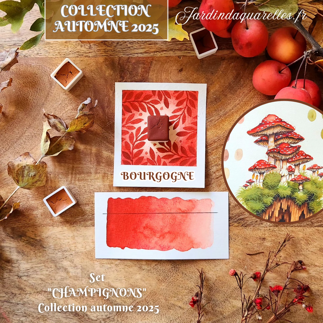 Bourgogne est une aquarelle artisanale de la collection automne, elle est donc éphémère. Elle est présente dans le set "CHAMPIGNONS" et dans la grande palette "COCOONING PALETTE ".
