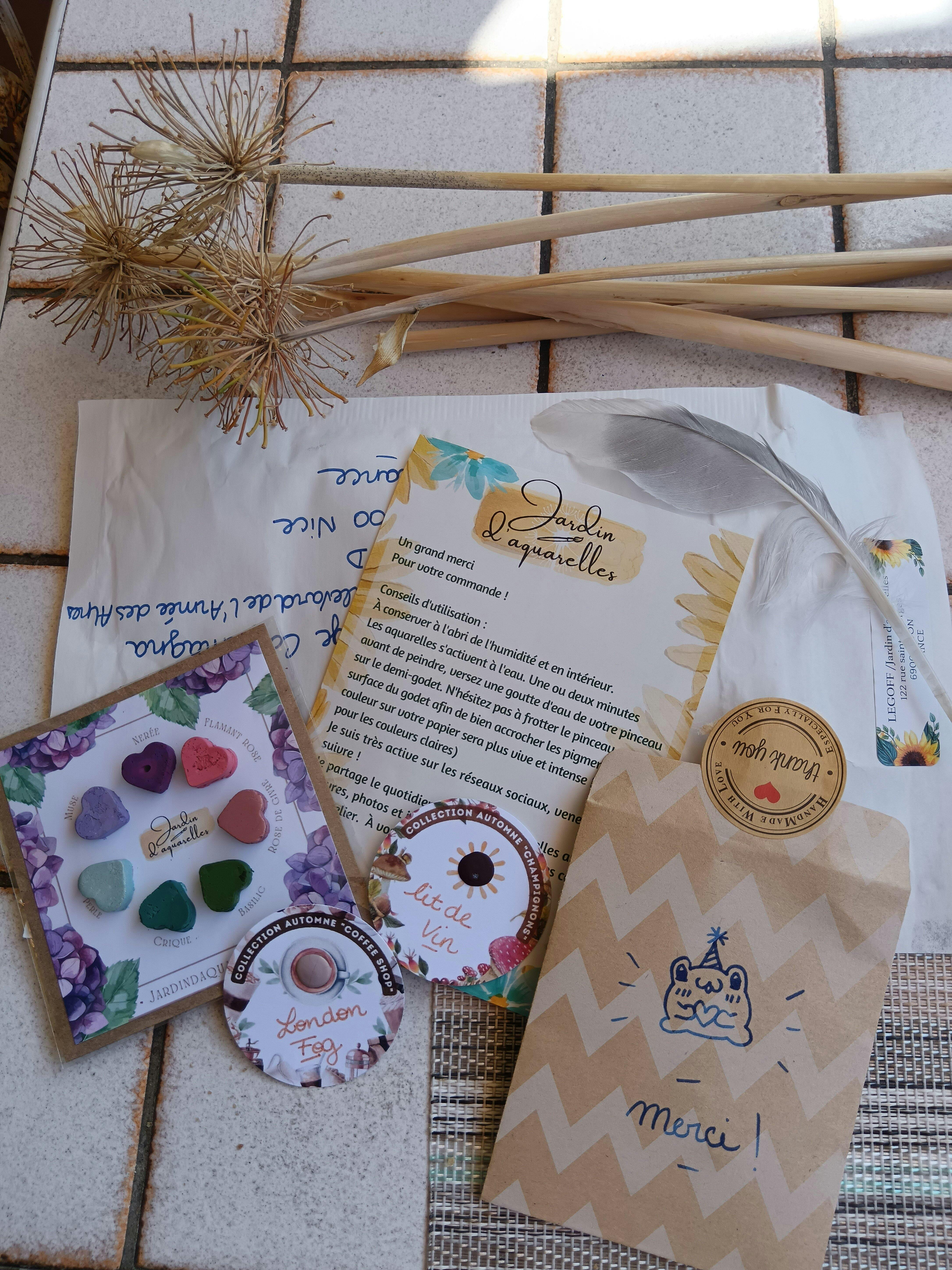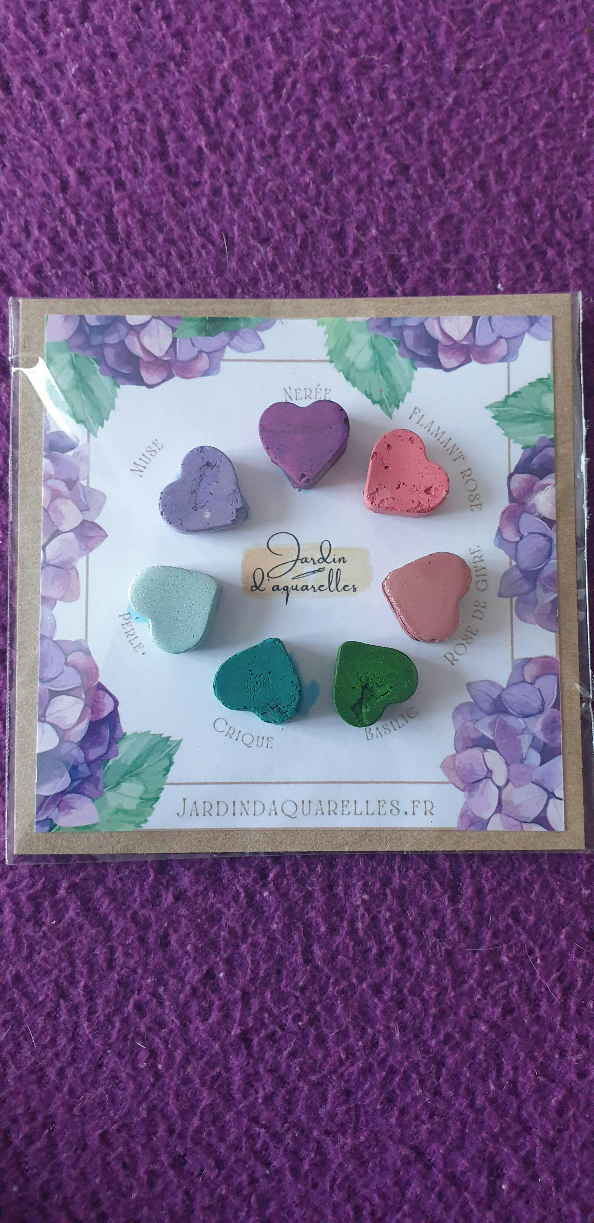 Carte aquarelle avec 7 cœurs d'aquarelles artisanales bien généreux
