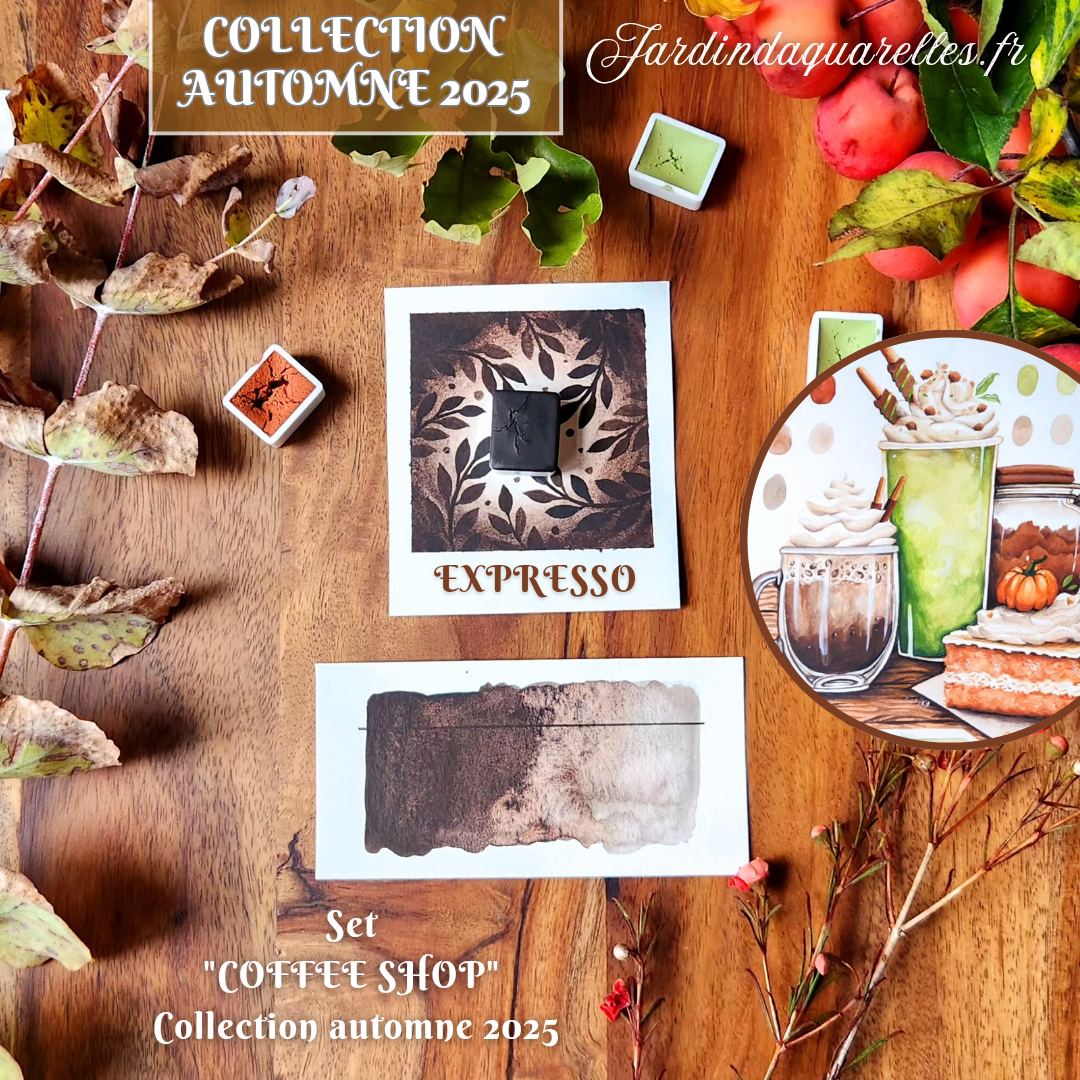Expresso est une aquarelle artisanale de la collection automne, elle est donc éphémère. Elle est présente dans le set "COFFEE SHOP" et la grande palette "COCOONING PALETTE ".